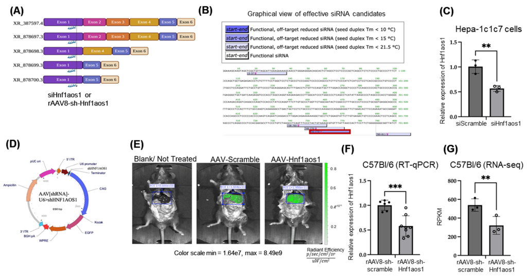 To achieve the aim, knockdown of HNf1aos1 was performed using AAV-shRNA complexes that targeted the liver. HNF1aos1 expression was suppressed in the mouse liver cell line using siRNA. RNA-seq and proteomics analysis were performed to reveal global changes in transcriptome and protein expression levels, following RT-qPCR to verify the expression of selected genes. Liver tissue histology and physical assessment were performed to visualize morphological and functional changes.